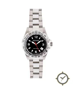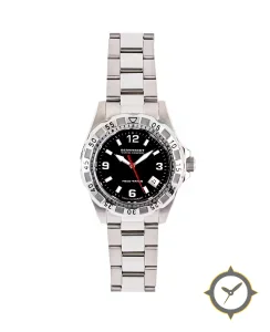 A Field watch with a vintage-inspired 33.5mm case, crafted from stainless steel featuring a black dial with a unique matte finish.