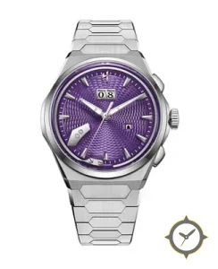 A Luxury watch with a vintage-inspired 35.5mm case, crafted from stainless steel featuring a purple dial with a unique guilloché (engine-turned) finish and a helpful power reserve indicator.