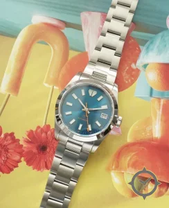 A Sports watch with a versatile 40.5mm case, that suits most wrists, crafted from stainless steel featuring a blue dial with a unique sunburst finish.