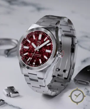 A Dive watch with a bold 44mm presence on the wrist, crafted from stainless steel featuring a crimson dial with a unique crushed/marbled stone texture finish.