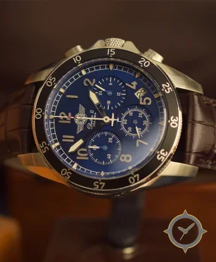A Pilot watch with a vintage-inspired 33.5mm case, crafted from stainless steel featuring a blue dial with a unique sunburst finish.