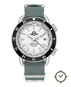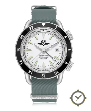A GMT watch with a bold 45mm presence on the wrist, crafted from stainless steel featuring a white dial with a unique matte finish, perfect for the global traveler with its world-time function.