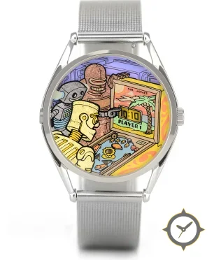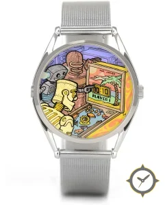 A Dress watch with a bold 42mm presence on the wrist, crafted from stainless steel featuring a purple dial with a unique printed illustration finish.