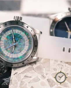 A GMT watch, crafted from stainless steel featuring a turquoise dial with a unique mother-of-pearl / iridescent finish.