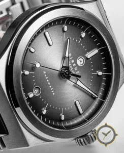 A Minimalist watch with a bold 46.5mm presence on the wrist, crafted from stainless steel featuring a gray dial with a unique sunburst brushed finish.