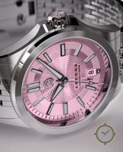 A Sports watch with a bold 43mm presence on the wrist, crafted from stainless steel featuring a crimson dial with a unique guilloché (concentric engine-turned texture) finish.