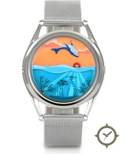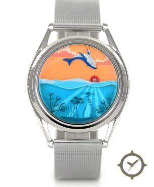 A Nautical watch with a vintage-inspired 30.5mm case, crafted from stainless steel featuring a blue dial with a unique illustrated/printed multi-layer scene with glossy finish finish.