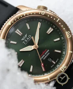 A Dive watch with a bold 44mm presence on the wrist, crafted from bronze featuring a green dial with a unique sunburst (radial) finish.
