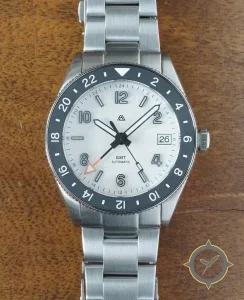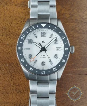 A GMT watch with a versatile 39mm case, that suits most wrists, crafted from stainless steel featuring a white dial with a unique pearlescent / mother-of-pearl finish finish and a true GMT complication for tracking a second time zone.