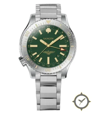 A Aviation watch with a versatile 40mm case, that suits most wrists, crafted from stainless steel featuring a green dial with a unique matte lacquer finish and a true GMT complication for tracking a second time zone.
