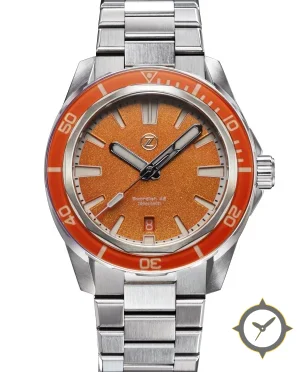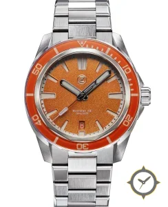 A Dive watch with a bold 48mm presence on the wrist, crafted from stainless steel featuring a orange dial with a unique sparkle/grain finish.
