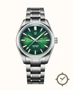 A Sports watch with a versatile 41mm case, that suits most wrists, crafted from stainless steel featuring a green dial with a unique sunburst radial texture finish.