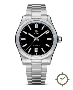 A Field watch with a bold 42.5mm presence on the wrist, crafted from stainless steel featuring a black dial with a unique glossy finish.