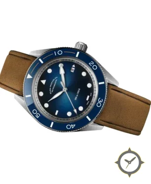 A Dive watch with a vintage-inspired 36mm case, crafted from stainless steel featuring a blue dial with a unique sunburst finish.