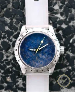 A Minimalist watch, crafted from stainless steel featuring a blue dial with a unique stone / marbled finish.