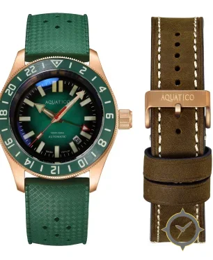 A GMT watch, crafted from bronze featuring a green dial with a unique sunburst/gradient finish and a true GMT complication for tracking a second time zone.