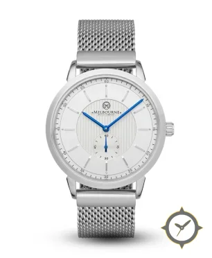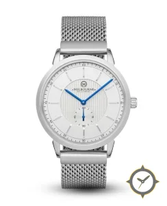 A Dress watch with a vintage-inspired 34.5mm case, crafted from stainless steel featuring a white dial with a unique smooth outer ring with vertically striped (pinstripe) center finish.