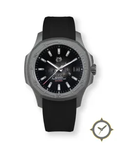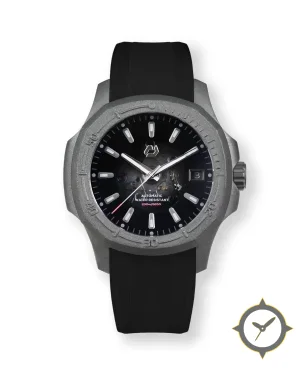 A Dive watch with a bold 42.5mm presence on the wrist, crafted from stainless steel featuring a black dial with a unique partially skeletonized finish.