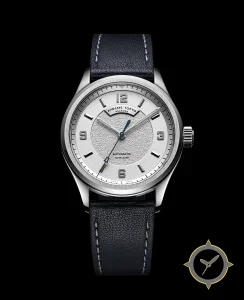 A Field watch with a bold 45mm presence on the wrist, crafted from stainless steel featuring a silver dial with a unique textured/grained central medallion with smooth/brushed outer chapter ring finish.