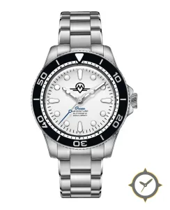 A Dive watch with a vintage-inspired 36.5mm case, crafted from stainless steel featuring a white dial with a unique matte finish.