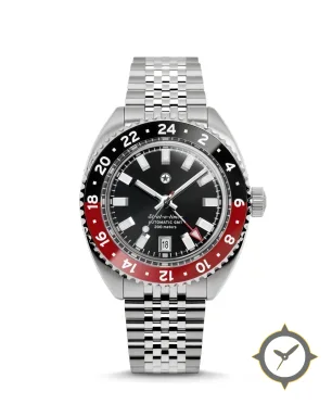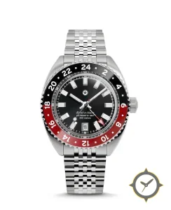 A GMT watch with a vintage-inspired 37.5mm case, crafted from stainless steel featuring a black dial with a unique matte finish and a true GMT complication for tracking a second time zone.