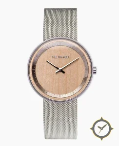 A Minimalist watch with a bold 43mm presence on the wrist, crafted from stainless steel featuring a brown dial with a unique wood finish.