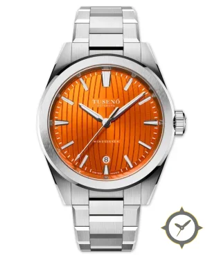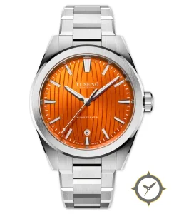 A Sports watch with a versatile 39mm case, that suits most wrists, crafted from stainless steel featuring a orange dial with a unique vertical ribbed / wave texture finish.