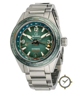 A GMT watch with a bold 46.5mm presence on the wrist, crafted from stainless steel featuring a green dial with a unique sunburst/grained finish, perfect for the global traveler with its world-time function.