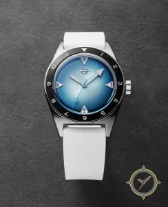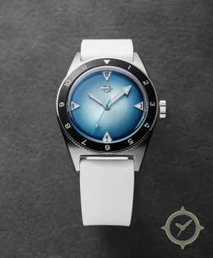 A GMT watch with a vintage-inspired 32mm case, crafted from stainless steel featuring a blue dial with a unique fumé/ombré sunburst finish and a true GMT complication for tracking a second time zone.