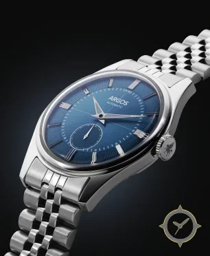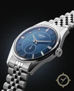 A Dress watch with a vintage-inspired 36.5mm case, crafted from stainless steel featuring a blue dial with a unique sunburst center with fluted/rail-track outer ring finish.