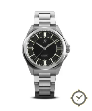 A Sports watch with a vintage-inspired 29mm case, crafted from stainless steel featuring a black dial with a unique sunburst center with textured/grainy outer ring (two-tone concentric finish) finish.