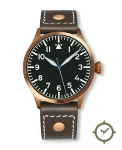 A Pilot watch with a vintage-inspired 34.5mm case, crafted from bronze featuring a black dial with a unique matte finish.