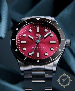 A Dive watch with a vintage-inspired 34.5mm case, crafted from stainless steel featuring a red dial with a unique sunburst finish.