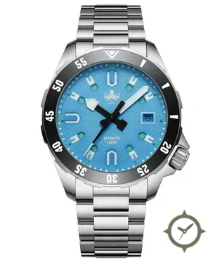 A Dive watch with a vintage-inspired 36mm case, crafted from stainless steel featuring a turquoise dial with a unique textured (grained) finish.