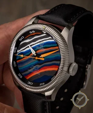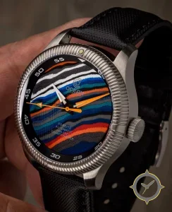 A Dive watch with a bold 46mm presence on the wrist, crafted from stainless steel featuring a blue dial with a unique multicolored textured/marbled finish (layered sand-art appearance) finish.