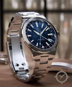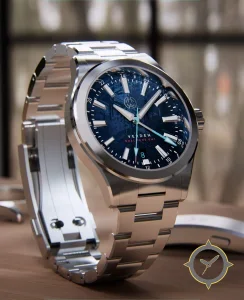A GMT watch with a versatile 40mm case, that suits most wrists, crafted from stainless steel featuring a blue dial with a unique textured (meteorite-style) finish and a true GMT complication for tracking a second time zone.
