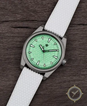 A Sports watch with a vintage-inspired 37mm case, crafted from titanium featuring a green dial with a unique embossed geometric triangular pattern (repeating triangles) finish.