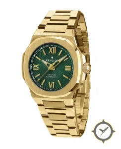 A Luxury watch with a vintage-inspired 32mm case, crafted from gold featuring a green dial with a unique guilloché finish.