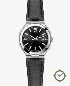A Sports watch, crafted from stainless steel featuring a black dial with a unique sunburst finish.