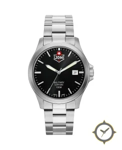 A Military watch with a versatile 40mm case, that suits most wrists, crafted from stainless steel featuring a black dial with a unique matte finish.