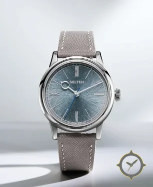 A Dress watch with a bold 45mm presence on the wrist, crafted from stainless steel featuring a blue dial with a unique grand feu enamel radial (sunburst) texture finish.