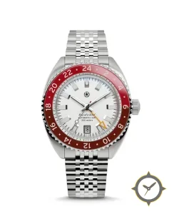 A GMT watch with a versatile 40mm case, that suits most wrists, crafted from stainless steel featuring a white dial with a unique matte finish and a true GMT complication for tracking a second time zone.