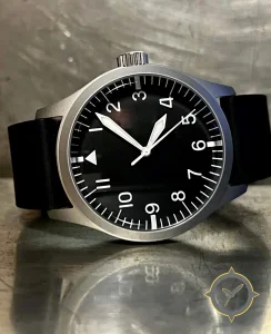A Pilot watch with a bold 45.5mm presence on the wrist, crafted from stainless steel featuring a black dial with a unique matte finish.