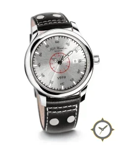 A Pilot watch with a bold 53mm presence on the wrist, crafted from stainless steel featuring a silver dial with a unique brushed finish.