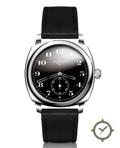 A Vintage watch with a versatile 39.5mm case, that suits most wrists, crafted from stainless steel featuring a black dial with a unique glossy lacquer with high polish reflection finish.