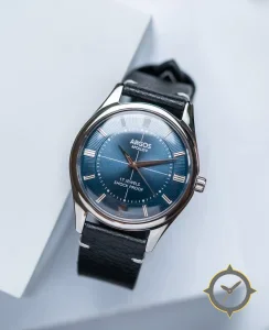 A Dress watch with a vintage-inspired 33.5mm case, crafted from stainless steel featuring a blue dial with a unique sunburst / radial brushing finish.