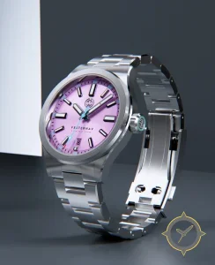 A Dive watch with a bold 43.5mm presence on the wrist, crafted from stainless steel featuring a purple dial with a unique sunburst finish.