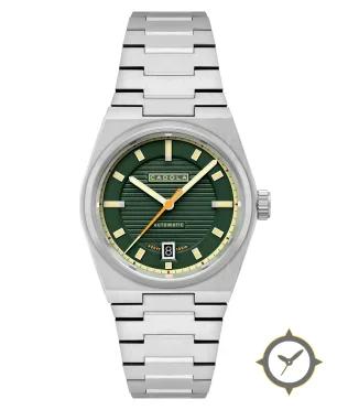 A Sports watch with a vintage-inspired 34.5mm case, crafted from stainless steel featuring a green dial with a unique horizontal ribbed / grooved finish.